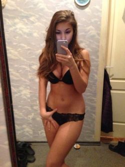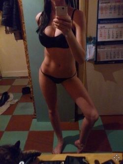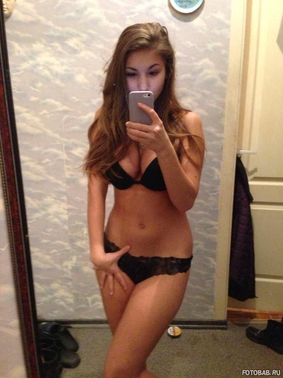 Стройная жгучая брюнетка в черных чулках и без трусов хочет самца