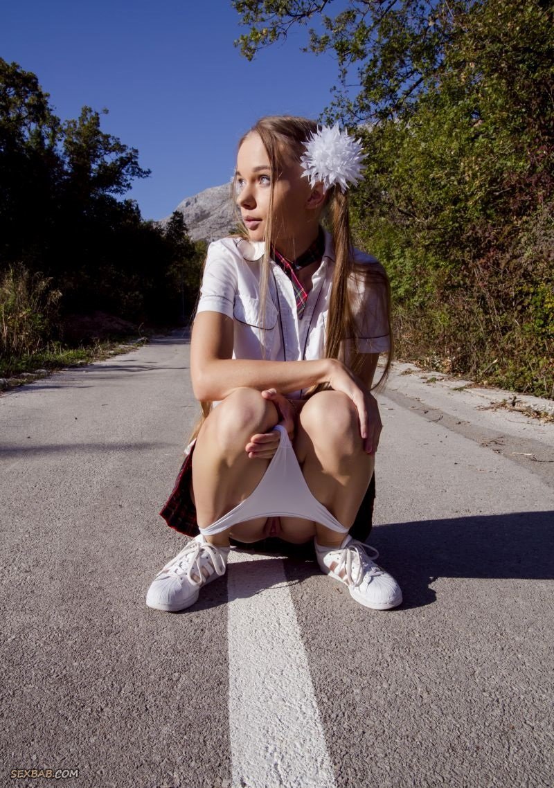 Молодая шлюшка дрочит бритую пизду на дороге
