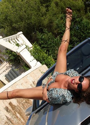 Описание: Страстно лаская свое горячее тело, похотливая сучка в легкой блузке без трусов резво залезла на крутую тачку и начала развратно тереться от нее своей голой упругой задницей. Сексуальная телка с натуральными сиськами на показ широко раздвигает ноги перед камерой и чувственно мастурбирует пальчиками свою волосатую подстриженную пизду.