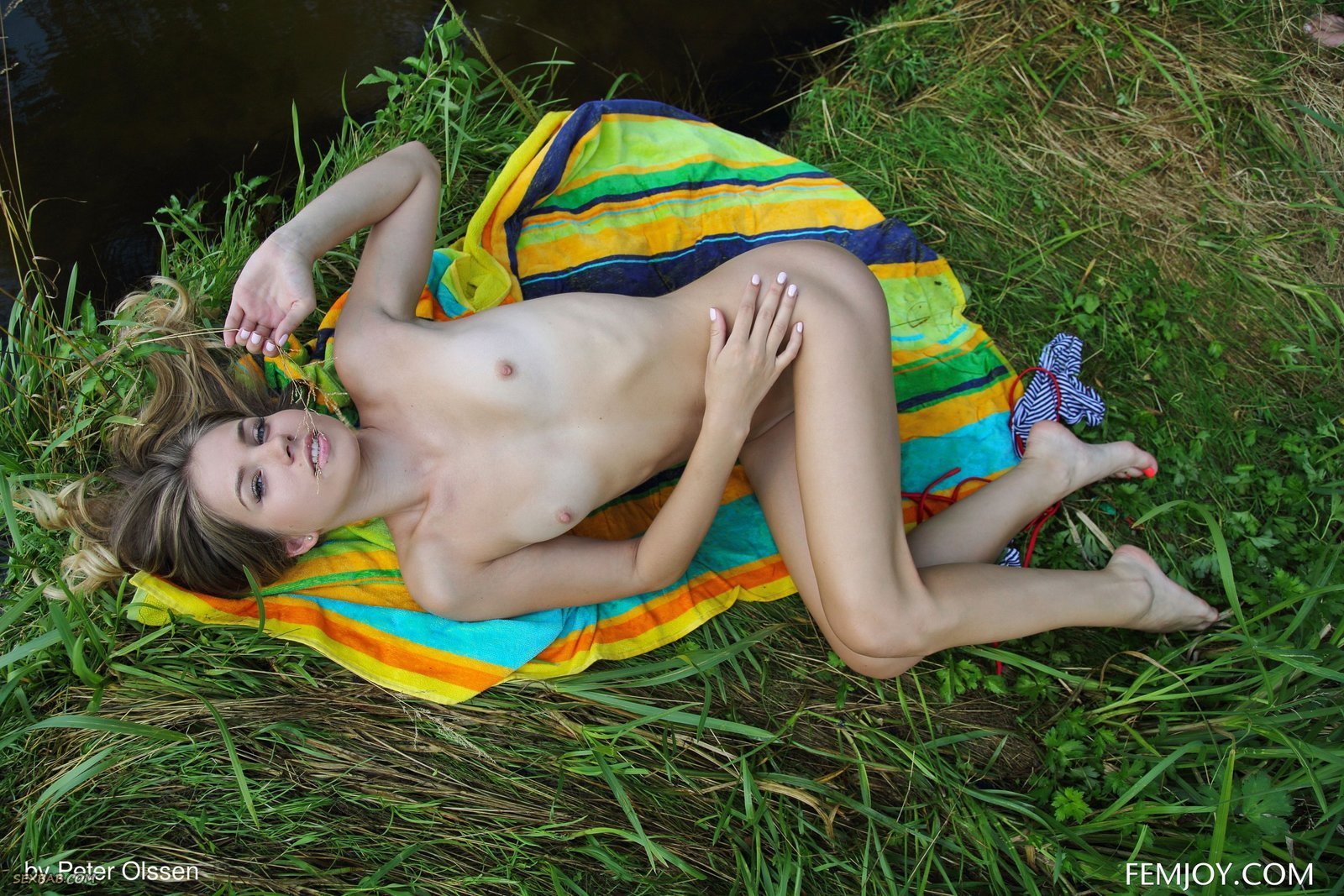 Описание: Отдыхая на берегу речки, молодая детка игриво сняла с себя откровенное бикини и весело купается голышом в теплой воде. Вдоволь накупавшись и устав, голая мокрая девушка с маленькими титьками расслабленно ложится на траву и бесстыже выставила на показ свое стройное нежное тело с упругой попкой и бритой киской.