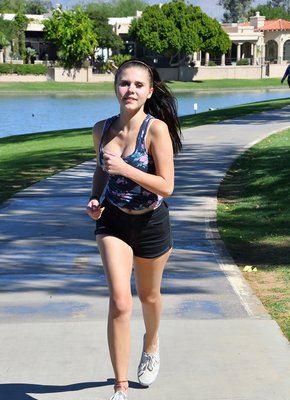 Описание: Симпатичная молодая девушка в коротких шортах и майке, наслаждаясь летним днем, позирует на утренней пробежке. Чередуя в процессе разные необычные ракурсы, сексуальная спортсменка довольно скоро открыла нашему взору свой лифчик, из которого вываливается её аппетитная грудь с красивым сосочком.