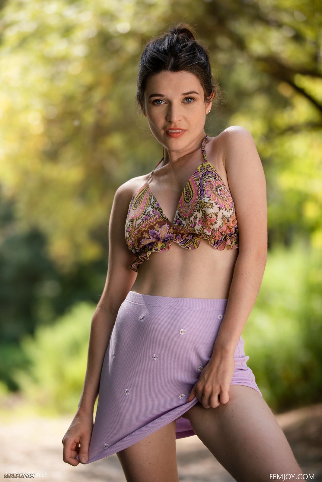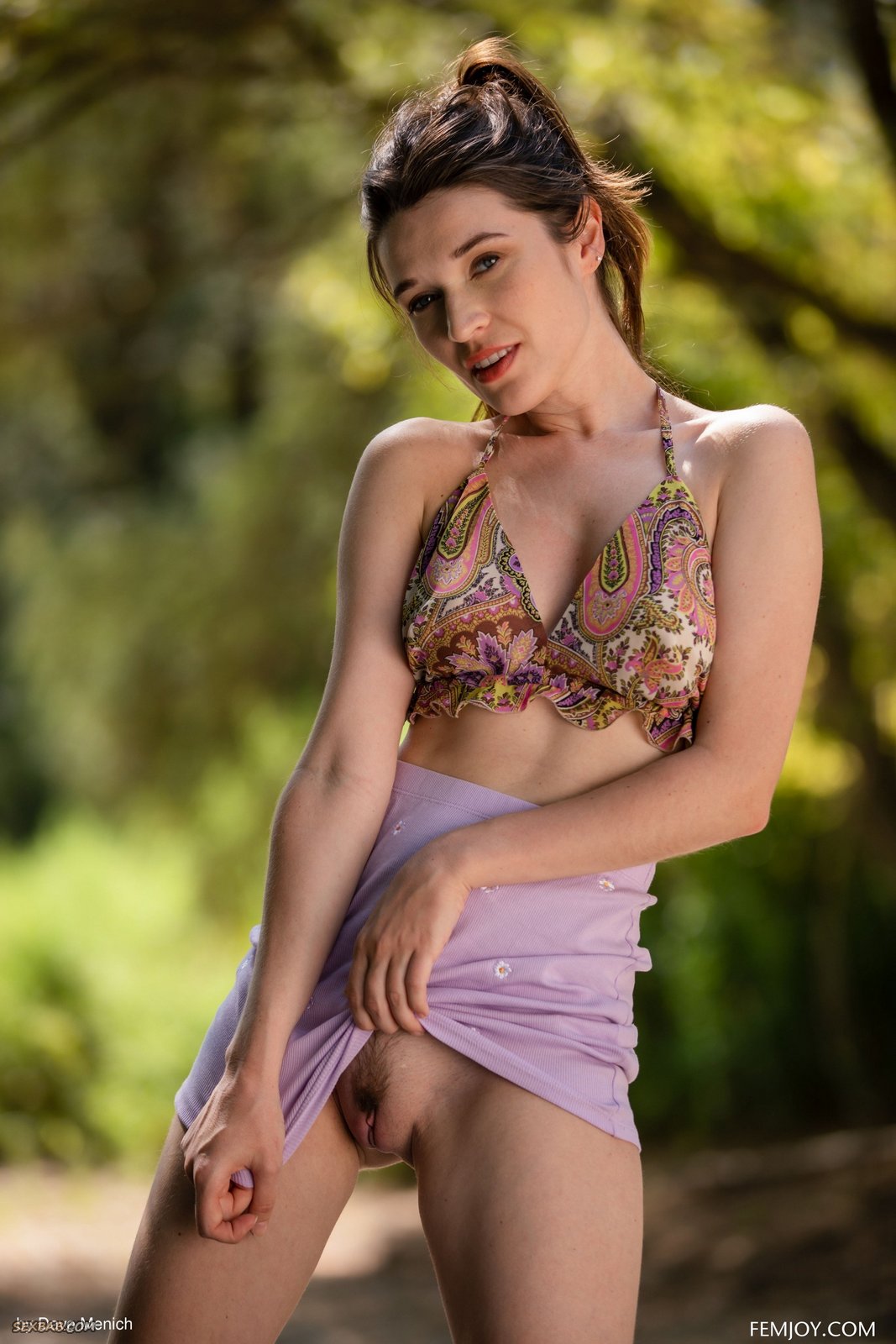 Описание: Страстно извиваясь перед камерой на фоне природы и постепенно стягивая с себя одежду, сексуальная тётка с голыми упругими сиськами кокетливо приподняла свою короткую юбку без трусов возбуждающе показала нам свой волосатый темный лобок и бритую маленькую пиздёнку между ног.