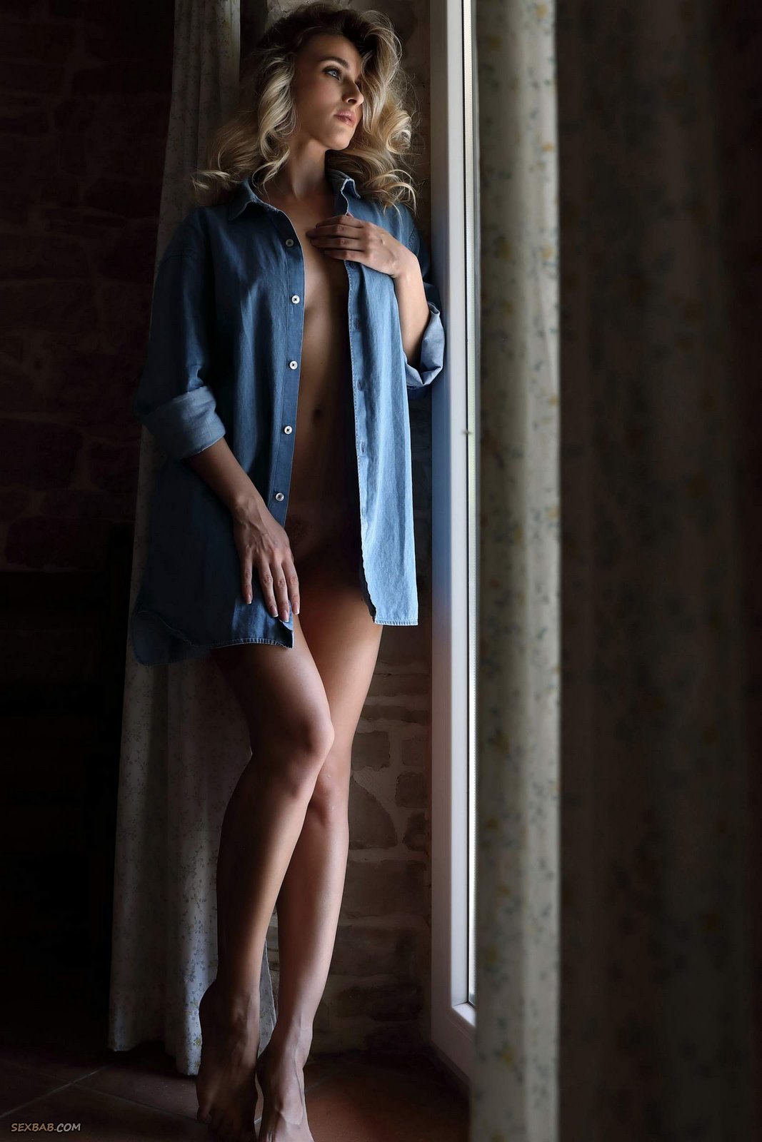 Описание: Соблазнительно извиваясь всем телом перед большим окном, сексуальная телка позирует в распахнутой рубашке на голое тело. Открыто демонстрируя на камеру свои натуральные упругие сиськи, белобрысая сучка также выпячивает как можно ближе к нам свою бритую письку с большими половыми губами и подстриженным волосатым лобком.