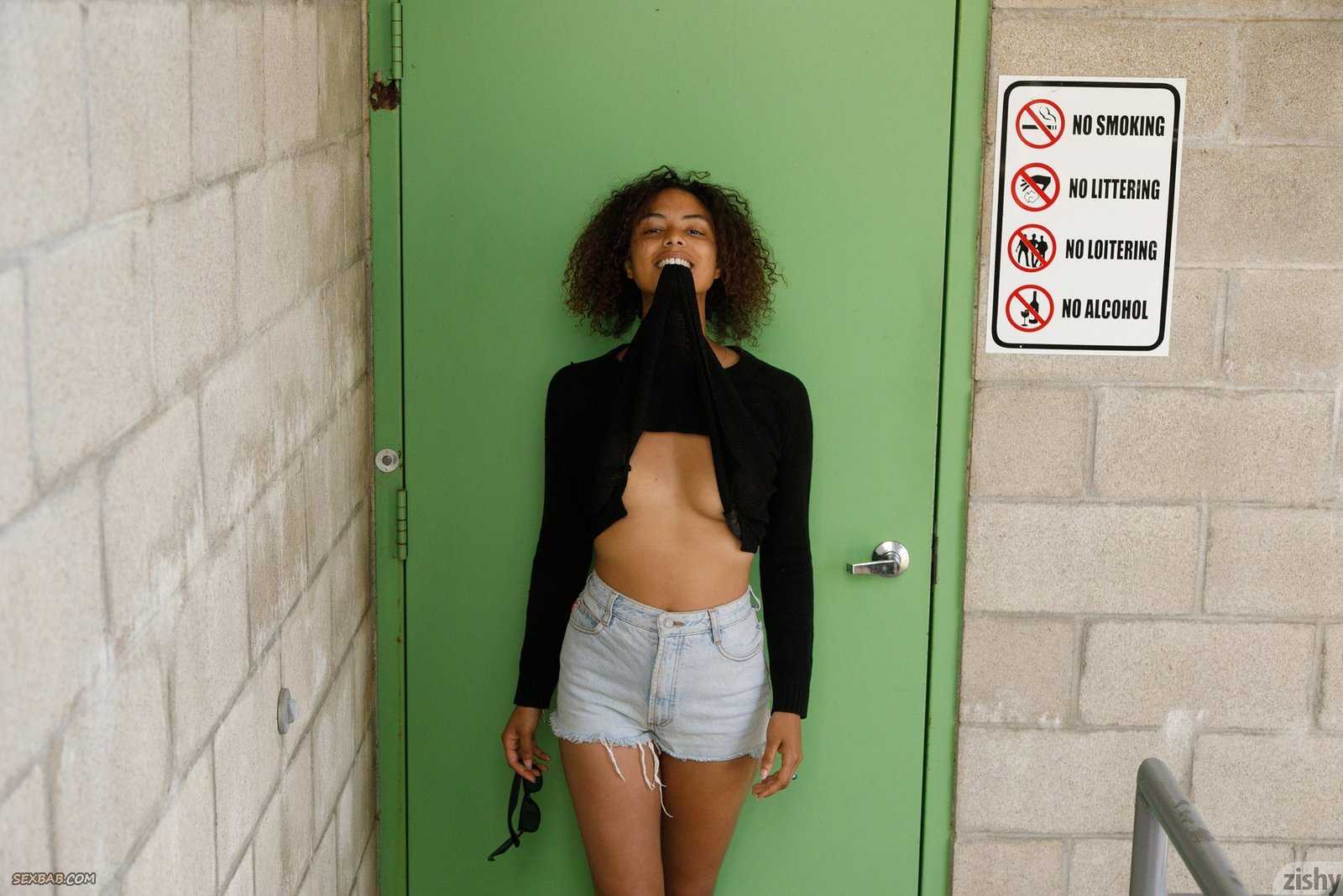 Описание: Надев кофту и короткие шорты, молодая негритянка с милой внешностью и стройной фигурой гуляет на улице с профессиональным фотографом. Часто меняя ракурсы перед его камерой, а порой широко раздвигая ноги, чернокожая девушка раскрывала свою промежность. В которой отчётливо виднелась коричневая писька, спрятанная за джинсовой тканью шорт.
