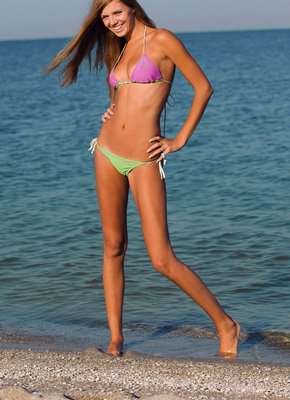 Описание: Отдыхая со своим бойфрендом на море, лучезарная худощавая девушка с ослепительной улыбкой позирует для него и показывает сексуальное тело, скидывая с себя купальник. Утопая во всевозможных комплементах, худышка с маленькой грудью и торчащими сосками порой забиралась в воду по щиколотки и игриво засвечивала там бритую письку.