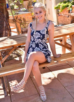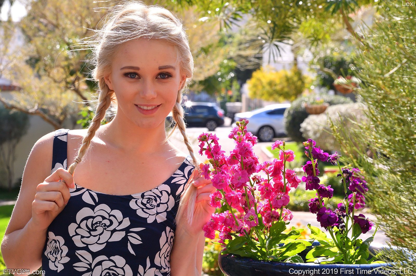 Описание: Привлекательная блондинка с косичками, в коротком платье, гуляя на улице, эротично позирует и грациозно прогибается раком, засвечивая белые трусики. Вернувшись же домой, молодая девушка раздевается до гола и располагаясь на кровати играет с вибратором, в это же время показывая нам маленькие сиськи с пирсингом в сосках и бритую письку.