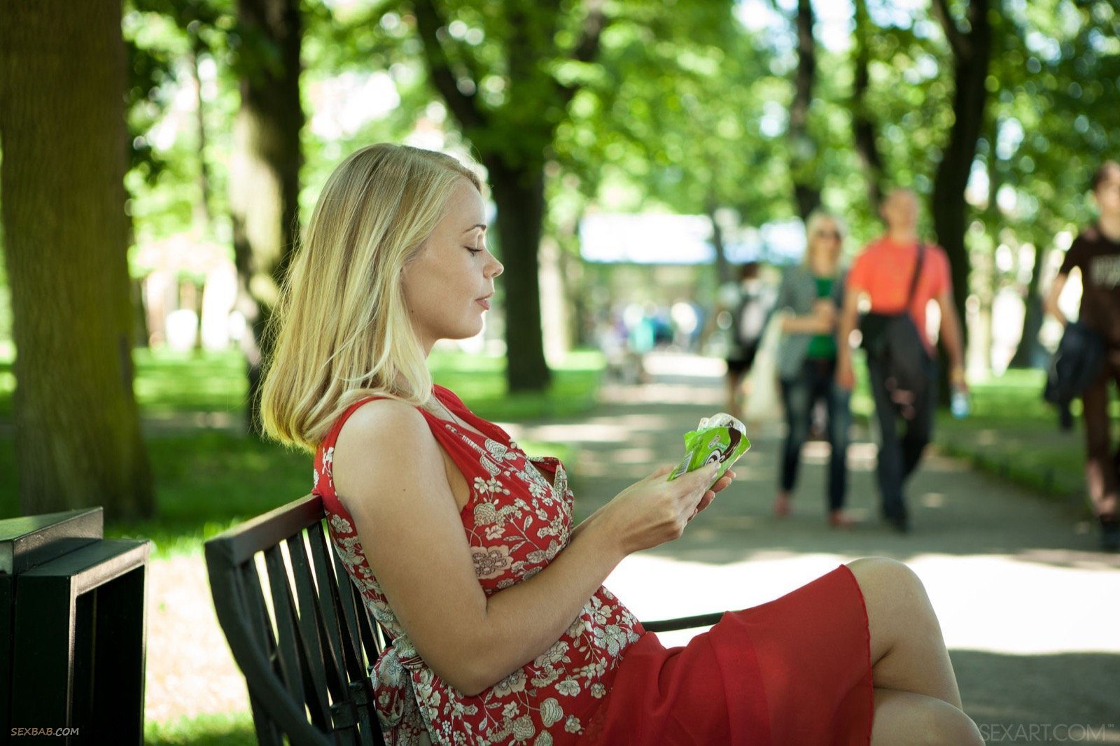 Описание: Симпатичная блондинка с достаточно сексуальным телом, нарядившись в платье, отправилась на прогулку в парк, где уже через несколько минут принялась засвечивать натуральные сиськи и возбуждающую гладко выбритую промежность. Спустя время, очаровательная крошка вернулась домой, где раздевшись полностью продолжила эротично позировать на кушетке и полу.