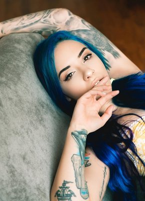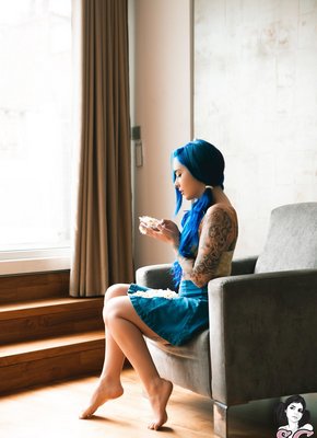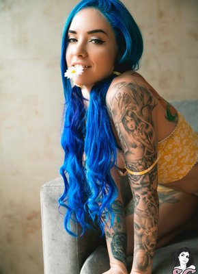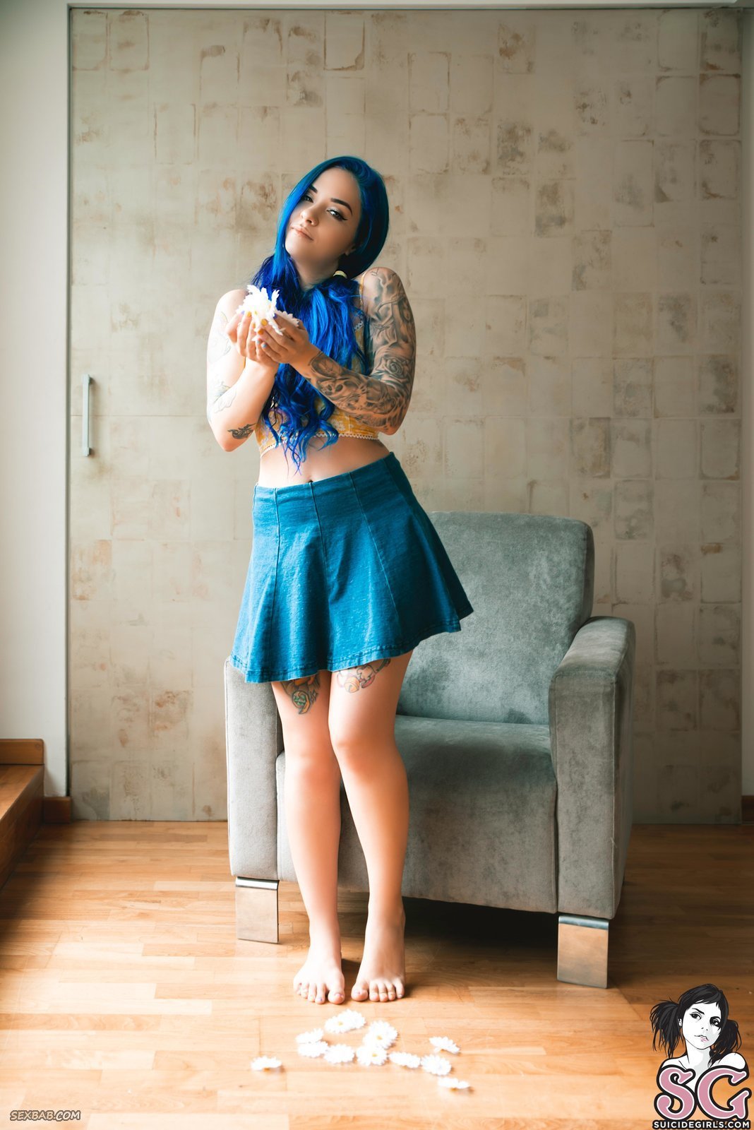 Описание: Босая милая неформалка с синими волосами в неглиже, надев юбку с трусиками и топик, эротично позирует дома и улыбаясь строит глазки в камеру. Соблазняя нас своим скромным взглядом, сексуальная модель вскоре раздевается догола и предстаёт перед нами во всей своей красе, смущённо прикрывая маленькие сиськи и скрещивая ноги.