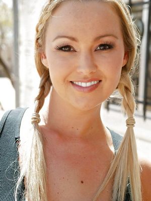 Сисястая блондинка в полосатом платье пытается удовлетвориться